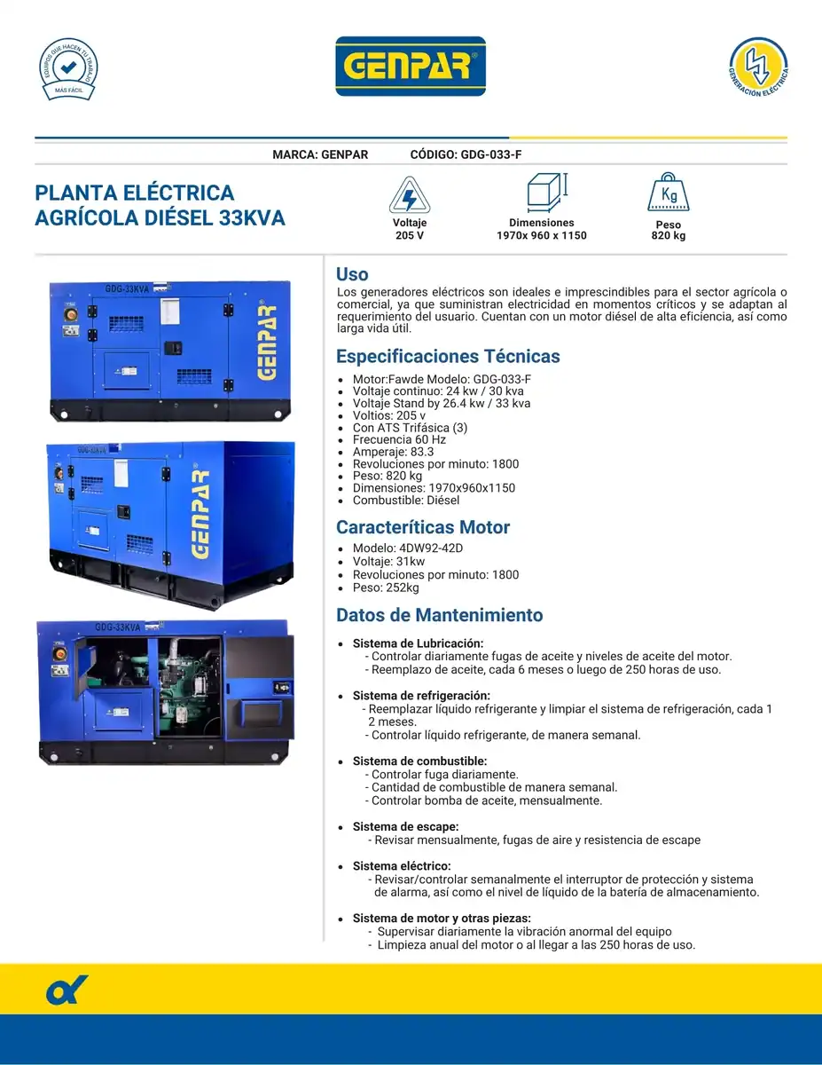 Los generadores eléctricos son ideales e imprescindibles para el sector agrícola o comercial, ya que suministran electricidad en momentos críticos y se adaptan al requerimiento del usuario. Cuentan con un motor diésel de alta eficiencia, así como larga vida útil.