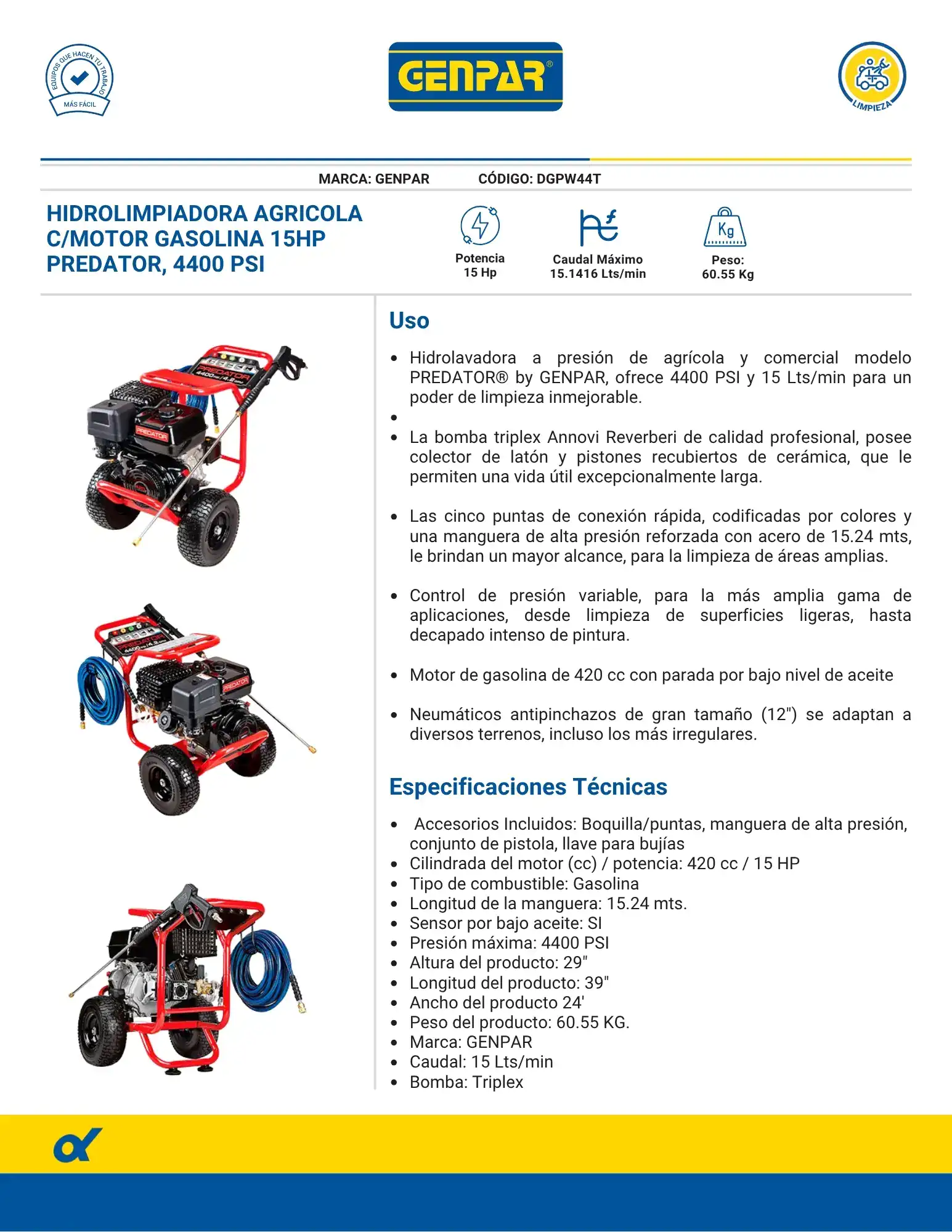 Hidrolavadora a presión de servicio industrial modelo PREDATOR® by GENPAR, ofrece 4400 PSI y 15 Lts/min para un poder de limpieza inmejorable.