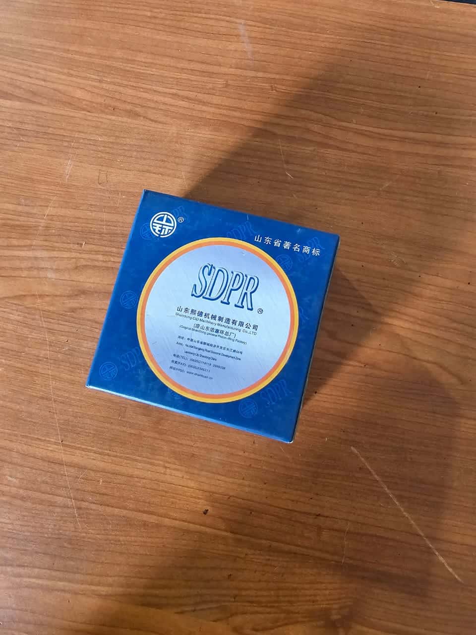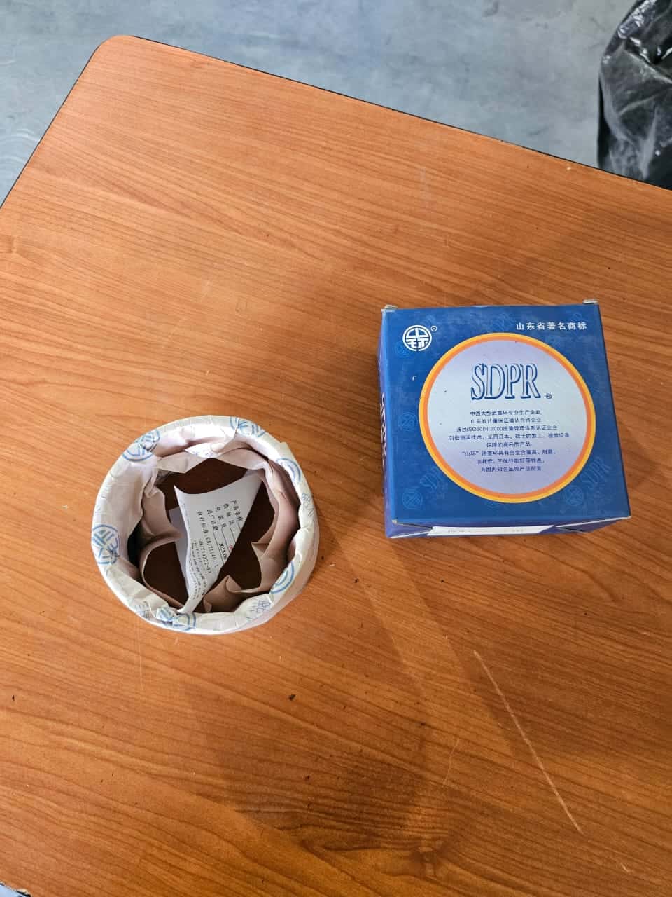 Anillo de retenedor de rodamientos SKF y caja de embalaje azul con logotipo SDPR en una superficie de madera. Ideal para mantenimiento y reparación de maquinaria industrial.
